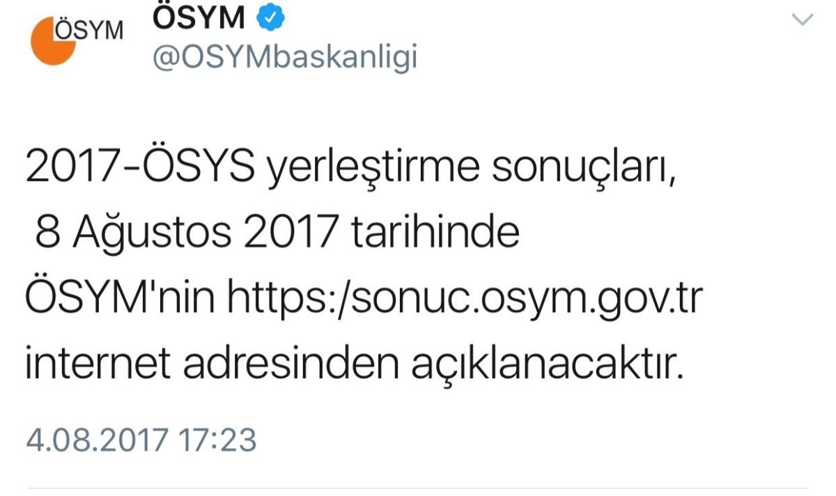 Atılan tweet’e göre 2017 ÖSYS üniversite yerleştirme sonuçları 8 Ağustos Salı günü https://sonuc.osym.gov.tr adresinden açıklanacak.