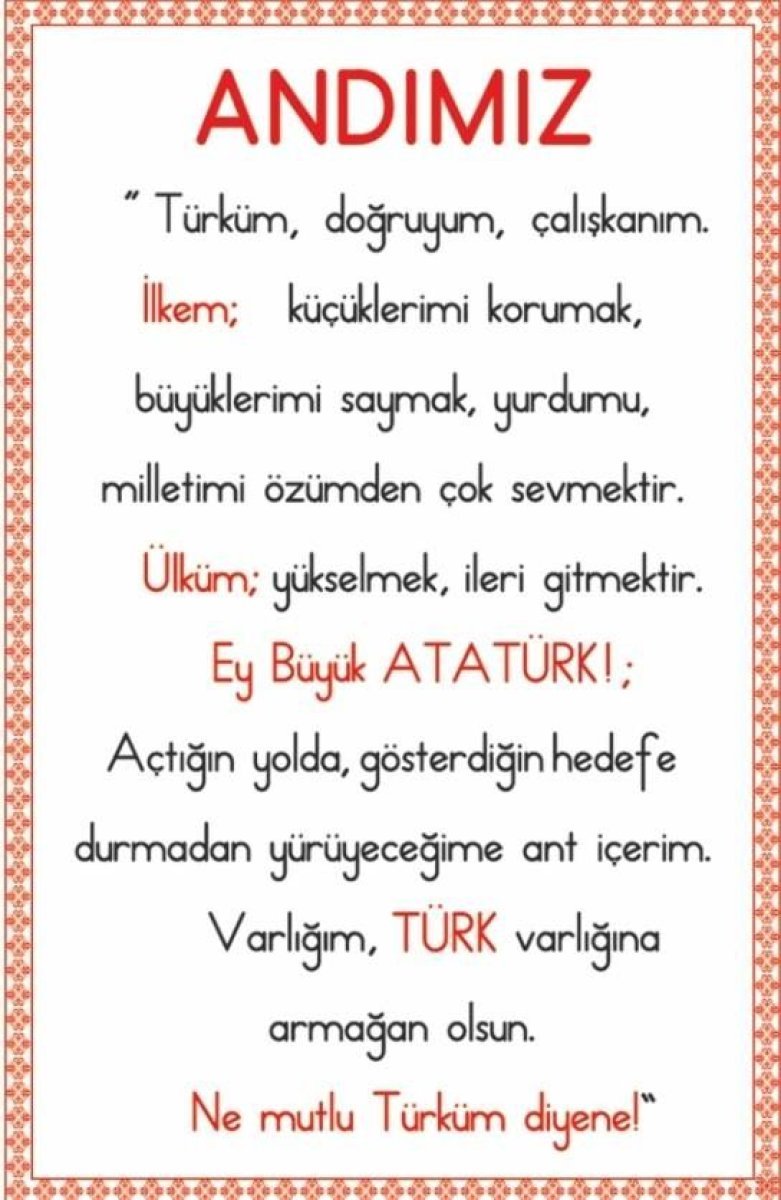 “Andımız” ilkokul öğrencilerinin vatan, millet, cumhuriyet kavramlarını pekiştirmek, için okutuluyordu. Üstelik birçok devlette benzer uygulamalar vardı. ABD’de okullara giderseniz sabahları çocukların “ABD’nin bayrağına ve o bayrağın simgelediği cumhuriyete bağlı kalacağıma, herkese özgürlük ve adaletle; tanrının gözetiminde, bölünmez, tek ulus için ant içerim” sözleri vardır.
