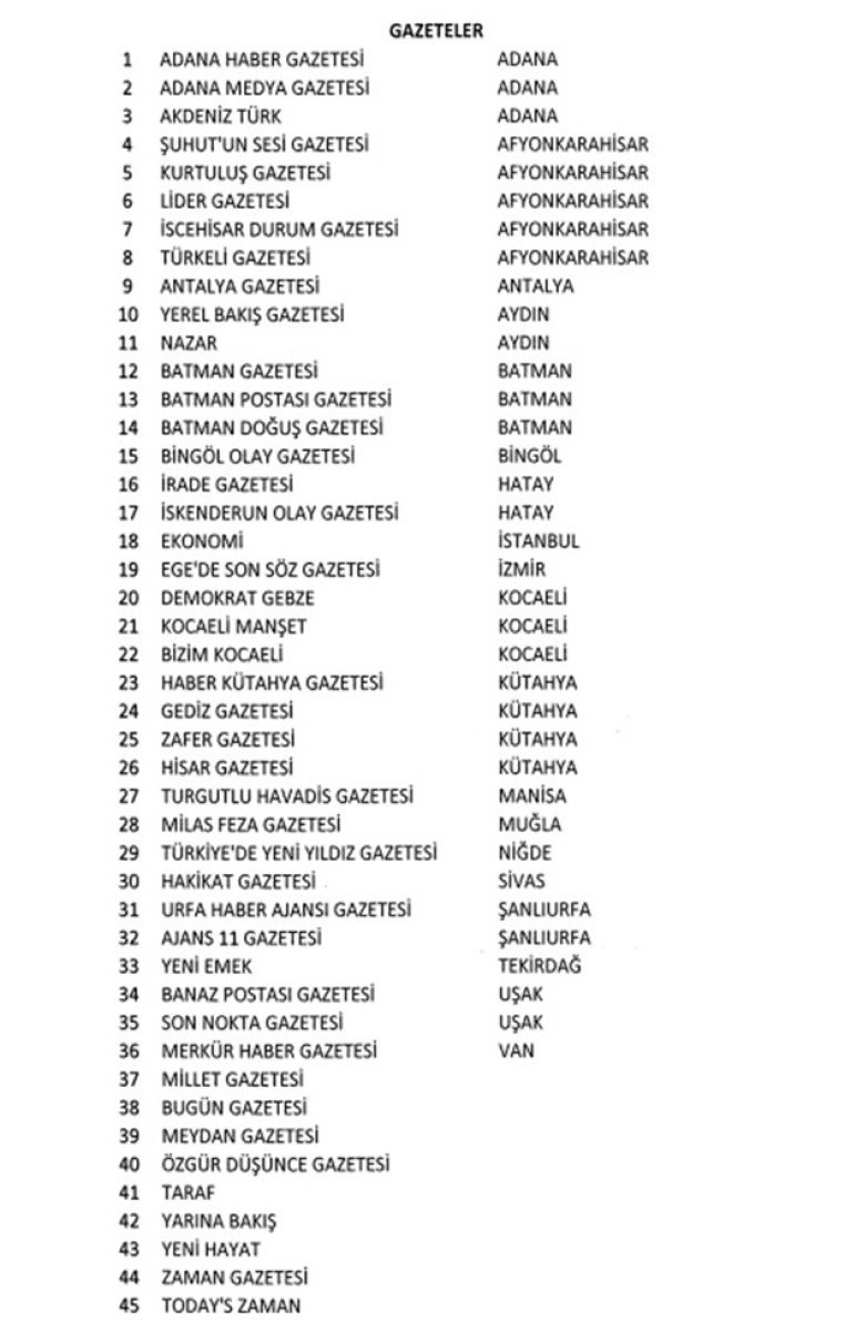Aralarında Zaman Gazetesi, Taraf, Samanyolu Tv, Kanaltürk, Sızıntı ve Aksiyon dergilerinin de bulunduğu, 45 gazete, 16 televizyon kanalı, 15 dergi, 29 yayınevi, 23 radyo kanalı ve 3 haber ajansı kapatıldı.
