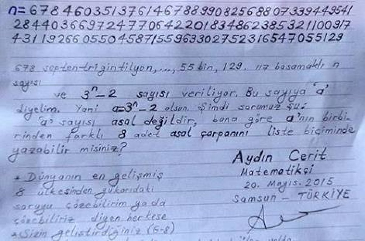 Samsun’da oturan emekli matematik öğretmeni Aydın Cerit, Türk malı yerli hesap makinesi yapılmasını sağlamak ve özellikle asal sayılar üzerine yaptığı çalışmalara dikkat çekmek için ödüllü bir matematik sorusu hazırladı. Cerit, soruyu çözüp 19 Mayıs 2017 saat 18.00’a kadar Samsun Öğretmenevi’ne gelip kendisine ulaştıran ilk kişiye bir ev, bir dükkan ve bankadaki bir miktar parasını vereceğini açıkladı.