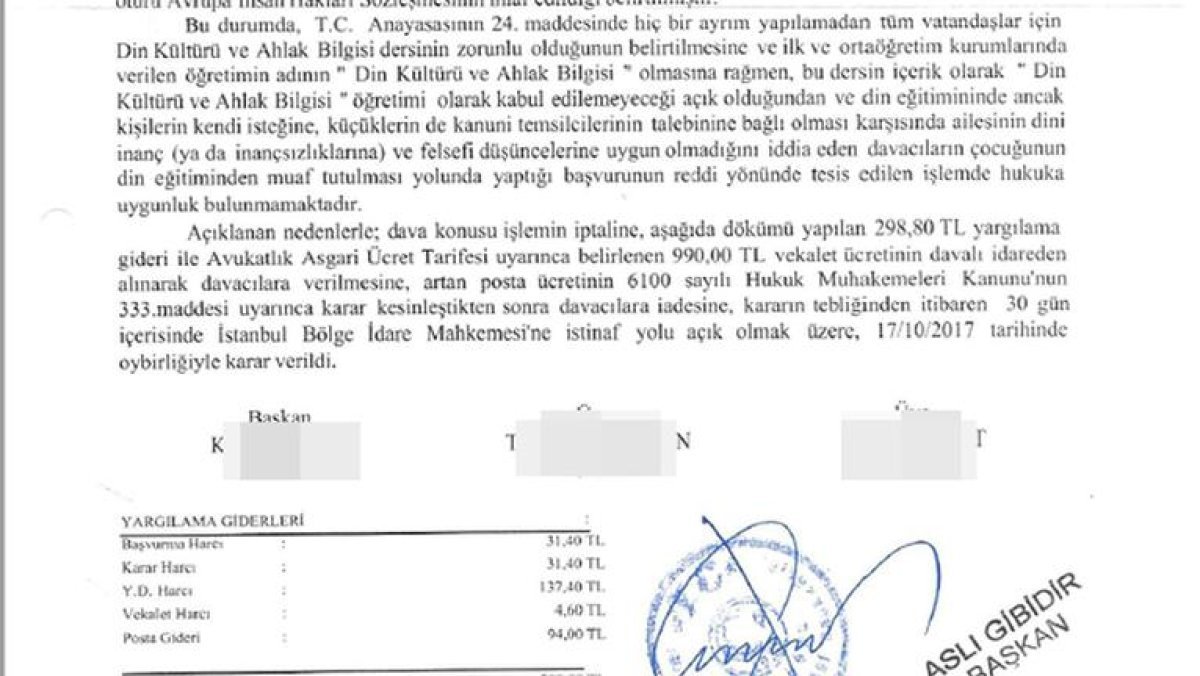 Avrupa İnsan Hakları Mahkemesi’nin benzer davalardaki kararlarına atıfta bulunulan idare mahkemesi kararının devamında şöyle denildi: “Din eğitiminden ancak kişilerin kendi isteğine, küçüklerin de kanuni temsilcilerinin talebine bağlı olması karşısında ailesini dini inanç (ya da inançsızlıklarına) ve felsefi düşüncelerine uygun olmadığını iddia eden davacıların çocuğunun din eğitiminden muaf tutulması yolunda yaptığı başvurunun reddi yönünde tesis edilen işlemde hukuka uygunluk bulunmamaktadır.”