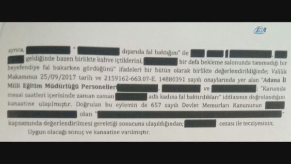 Adana İl Milli Eğitim Müdürlüğünde görevli bazı kadın ve erkek personel, mesai saati içinde dışarıdan gelen bir kadına kahve falına baktırdıkları iddiasıyla uyarı cezası aldı.