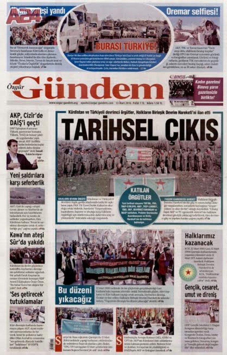 Özgür Gündem’in bir paçavradan ibaret olduğunu burada da görmekteyiz. Vatan topraklarında faaliyet gösteren terör örgütlerinden bazılarının (içinde PKK’nın da olduğu) Cumhuriyet’e karşı birleşmelerini tarihsel bir çıkış olarak görüyor. Ancak zaman içerisinde görmüş olduk ki bu tür adımlar safları daha da netleştiriyor, saflar vatanseverler ve bölücüler olmak üzere berraklaşıyor. Bu saflaşmada da emperyalist destekli bölücü hareketin başı ezilmektedir. İşte asıl “Tarihsel Çıkış” budur!