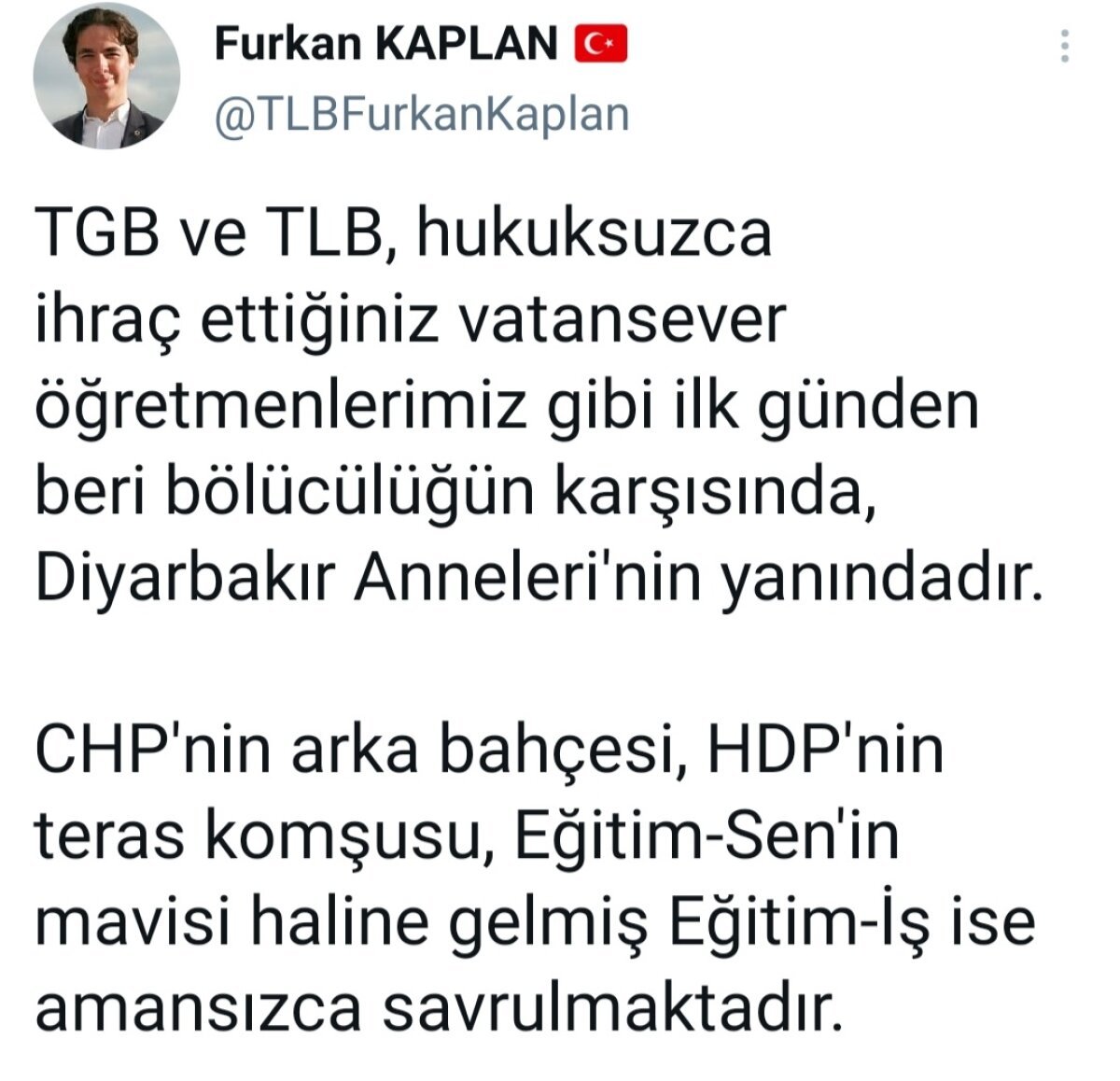 Türkiye Liseliler Birliği Genel Başkanı Furkan Kaplan Eğitim İş Genel Başkanı Orhan Yıldırım’ın, Diyarbakır HDP İl Binası önünde evlat nöbetinde bulunan annelere destekte bulunan öğretmenlerin ihracına ilişkin açıklamasını eleştirdi.