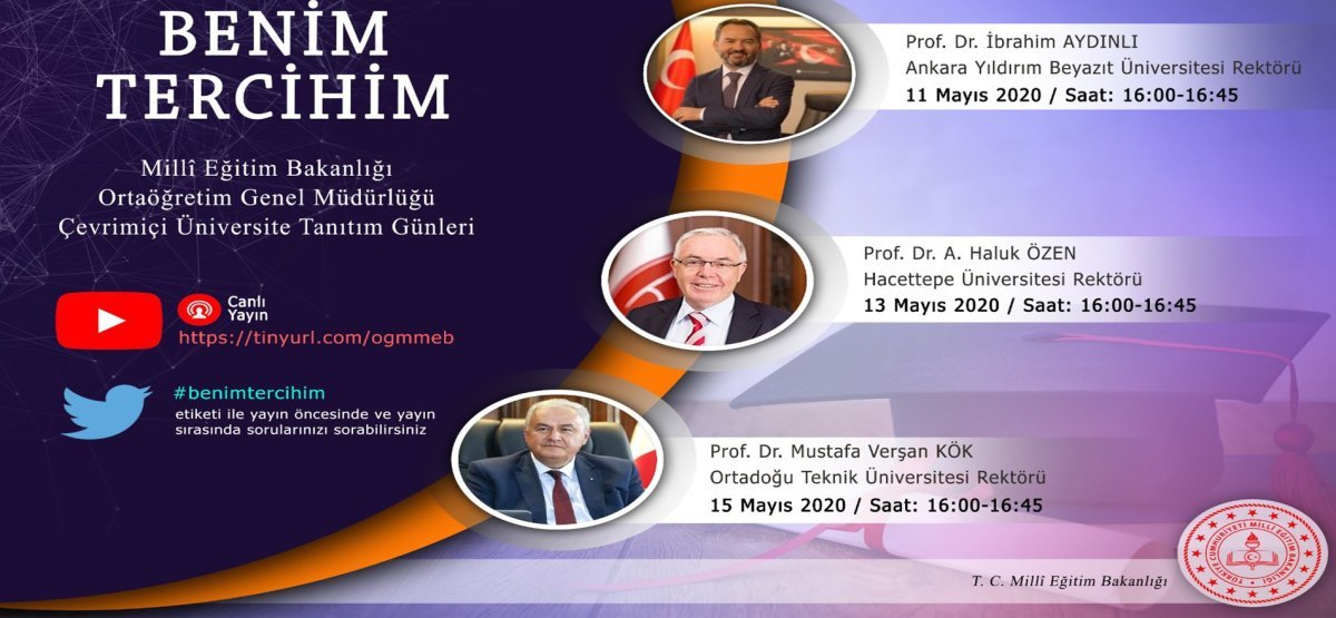 Mete, bugün saat 16.00’da Ankara Yıldırım Beyazıt Üniversitesi Rektörü Prof. Dr. İbrahim Aydınlı, 13 Mayıs’ta Hacettepe Üniversitesi Rektörü Prof. Dr. Haluk Özen, 15 Mayıs’ta ise ODTÜ Rektörü Prof. Dr. Mustafa Verşan Kök’ün üniversitelerini tanıtacağını ve YKS adaylarının sorularını yanıtlayacağını belirterek, daha sonraki programların öğrencilere ayrıca duyurulacağını belirtti.