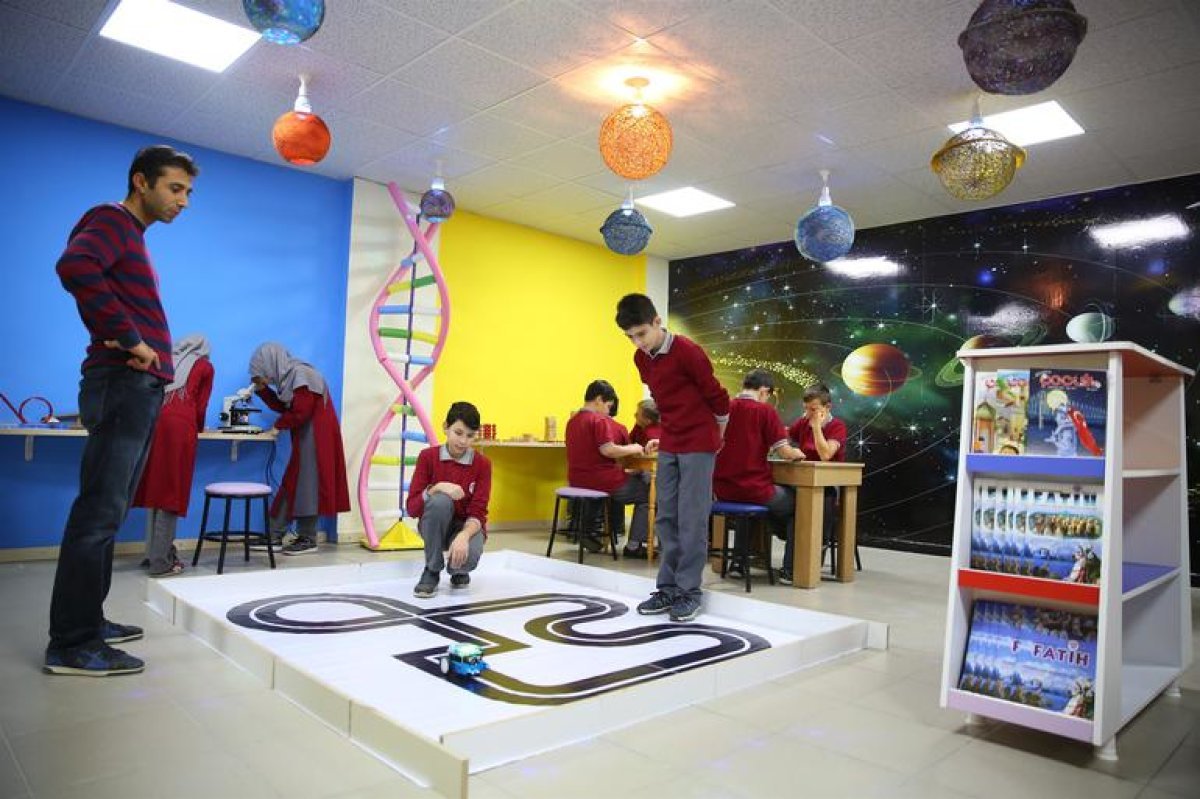 Velilerle çalışarak oluşturdukları bilim sınıfında oturma şeklini, öğrencilerin hem bireysel hem de grup halinde çalışmaları amacıyla altıgen şeklinde tasarladıklarını anlatan Çetin, “Velilerimizle hafta sonları ve akşamları saat 17.00’den sonra gece yarılarını kadar çalıştığımız oldu. El becerilerimizle tasarladığımız sistemde güneş ve gezegenleri yaşatmaya çalıştık, bunlara hareketlilik kazandırdık. Işıkları kapattığımızda sınıfta görsel bir şölen oluşsun istedik. Çocuklarımız bu ortamda çok eğleniyor” dedi.