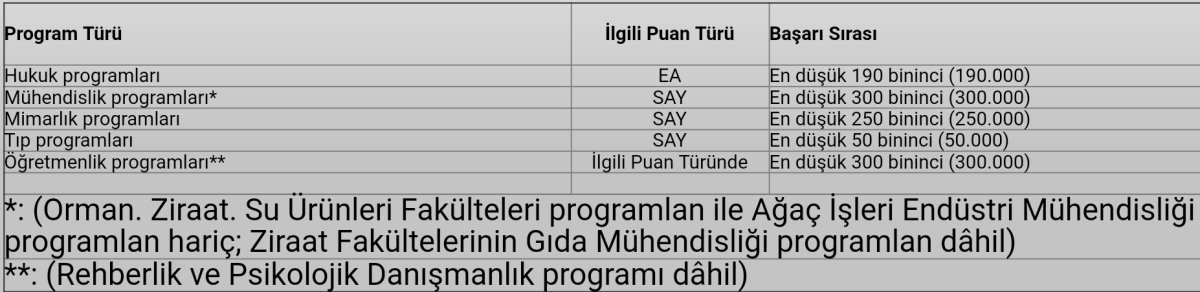 Açıklanan sınav sonuçları, kontenjanlar ve farklı puan türlerinde tercih hakkı kazanan öğrenci havuzunun genişlemiş olması durumu birlikte analiz edilmiştir. Bu analizler sonucunda öğrencilerimizin lehine olmak üzere önceki yıllarda yürürlüğe konulan bazı programlara ait başarı sırası sınırlamalarının kalite önceliğimizden sarfınazar edilmeksizin genişletilmesi uygun görülmüş ve ilgili programların tercih edilebilmesi için gerekli olan asgari başarı sıralaması sınırları bu yıl için aşağıdaki şekilde belirlenmiştir.” dendi.