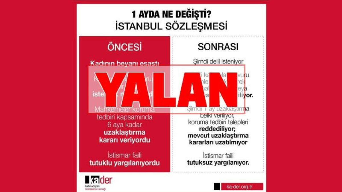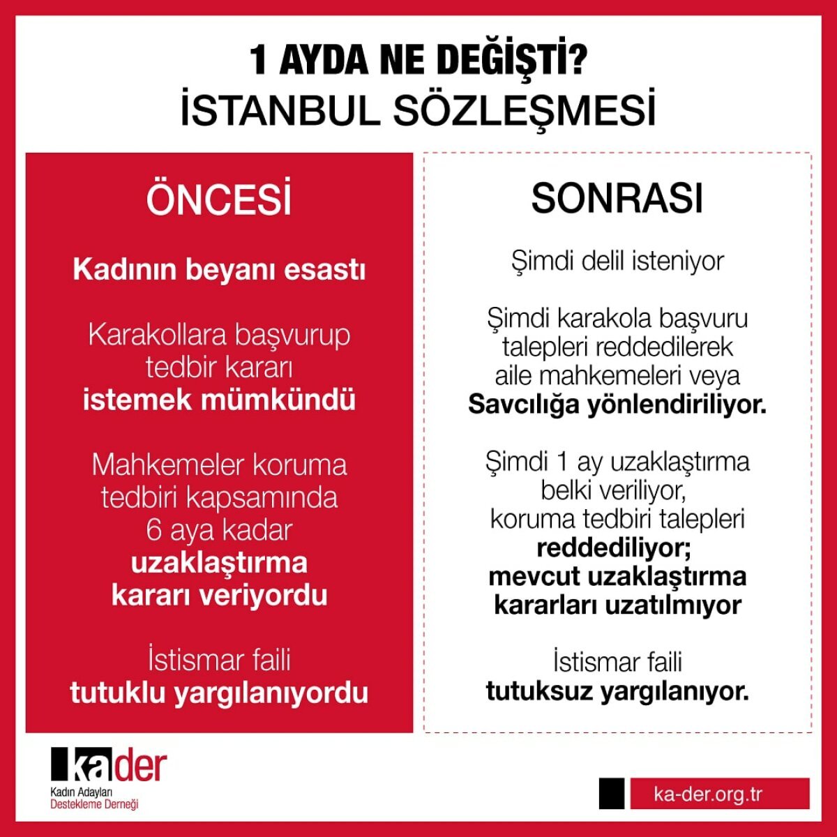 İstanbul Sözleşmesi’nin feshedilmesinden sonra sosyal medyada çokça görülen kara propagandalar ve ABD tarafından fonlanan Batı menşeili feminist/feminazi toplulukları tarafından sokaklarda eylemler yapıldı. Bu eylemlerin hemen ardından Kadın Adayları Destekleme Derneği (Ka-Der) hiçbir doğruluğu, elle tutulabilecek bir kaynağı bile olmayan “1 Ayda Ne Değişti?” başlıklı bir görsel yayınladı.