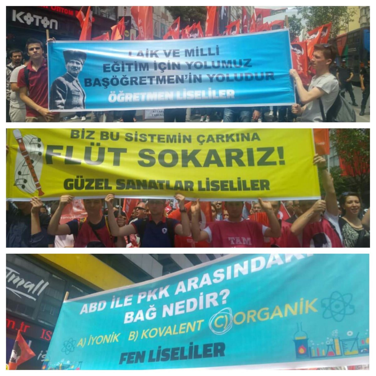 Fen Lisesi öğrencileri “ABD ile PKK arasındaki bağ nedir, -Organik” Güzel Sanatlar Lisesi öğrencileri “Biz bu sistemin çarkına flüt sokarız” Öğretmen Lisesi Öğrencileri, “Laik ve Milli Eğitim için yolumuz Başöğretmenin yoludur” pankartlarıyla yürüdü.