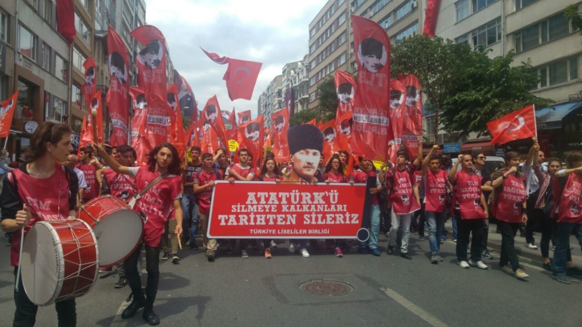 Oldukça coşkulu ve renkli bir kortejle yürüyen TLB, liselilerin birinci vazifesini on binlerle haykırdı. Atatürk’ü silmeye kalkanları tarihten sileriz!” Maketini önde taşıyan liseliler, “Atatürk gençliği görev başında” “Liseler bizimle aydınlanacak” “Hepimiz Mehmediz PKK’ya yeteriz” sloganlarıyla İstanbul’u ayağa kaldırdı!