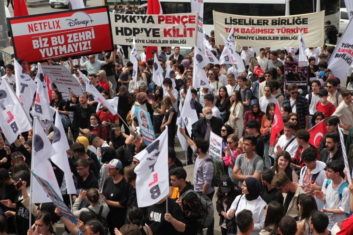 Karanlık, “Netflix, Youtube, Tiktok’ta onlarca içerik kız olduğumuzu erkek olduğumuzu reddedip cinsiyetsiz insanlar olmamızı öğütlüyor. En son da çocukluğumuzda izlediğimiz neredeyse tüm çizgi filmleri yapan Disney yapımlarında LGBT karakterleri yüzde elli arttıracağını açıkladı. Soruyoruz onlara: bize ne öğretmeye çalışıyorsunuz? Daha cinsiyetini bile yeni yeni öğrenen küçücük çocuklara neler izletmek istiyorsunuz? LGBT çocuk yoktur çocuk istismarı vardı! Bizim çocukluğumuzu bile elimizden almak isteyenlere artık yeter diyoruz. Liseliler ayakta! Bize dayattıklarınızı kabul etmiyoruz. Özgürlük diyerek bizi hapsetmenizi kabul etmiyoruz! Özgürlük burada konuşabilmek demek. Özgürlük bu meydanda toplanabilmek demek.