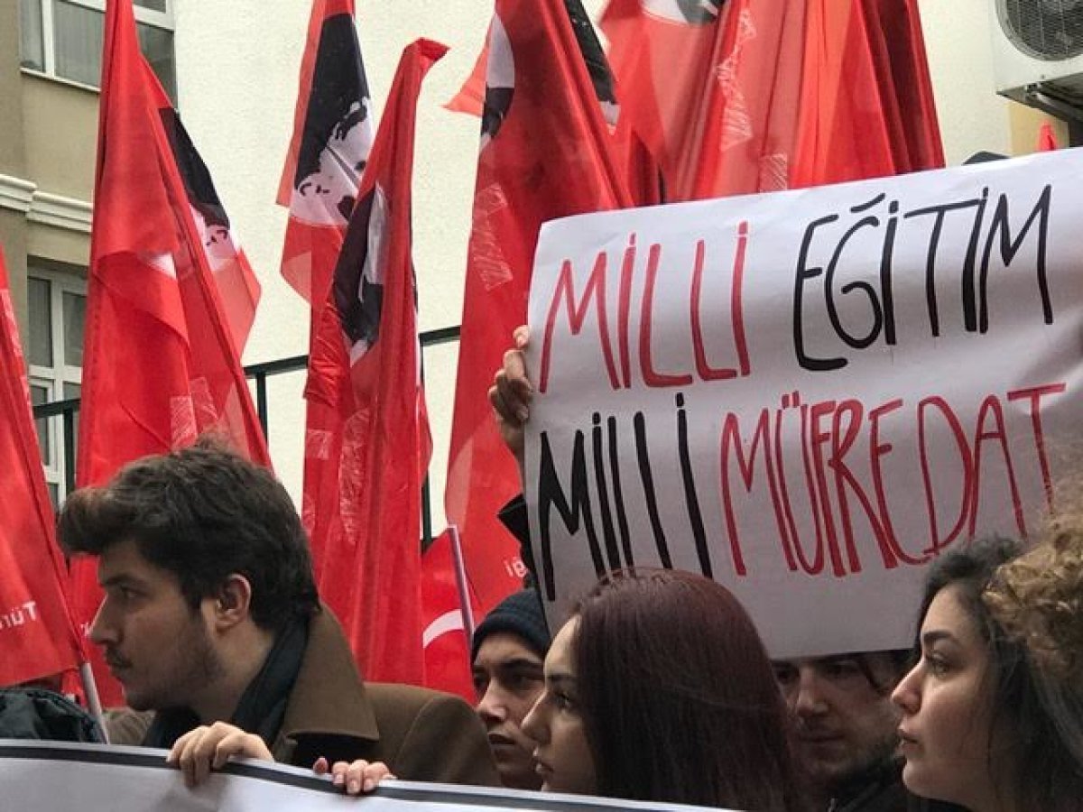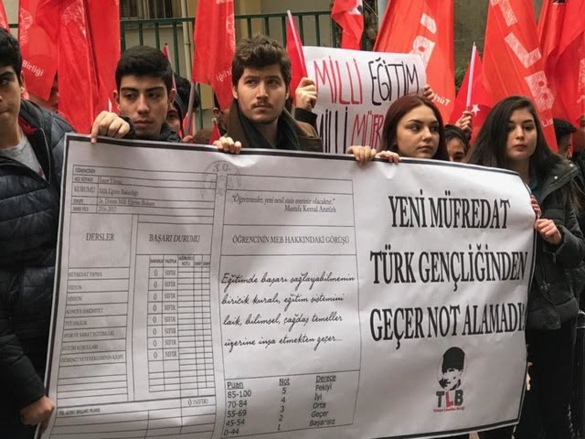 Türkiye Liseliler Birliği (TLB) üyeleri, Milli Eğitim Bakanlığı’nın 17 Ocak tarihinde açıkladığı yeni müfredat taslağına karşı ayağa kalktı. ‘‘MEB’e Karnesini Veriyoruz’’ sloganıyla Kadıköy İlçe Milli Eğitim Müdürlüğü önünde buluşan liseliler müfredat taslağı hakkındaki görüşlerini açıkladı. Açıklamayı yapan TLB Genel Başkanı Bora Çelik, taslağın çalakalem yazıldığını ve eğimin temel sorunlarını çözmediğini belirtti. Çelik, ‘‘Bu taslak Karen Fogg’un hayalidir. Doğrudan milli devletimizi hedef almaktadır. Bu taslakta ısrar etmek emperyalizm destekli PKK’nın, FETÖ’nün ekmeğine yağ sürmektir. Unutmayalım ki FETÖ 15 Temmuz Amerikancı darbe girişimini eğitimi kurumlarını kullanarak elde ettiği güçle gerçekleştirdi. Cumhurbaşkanı yaverinin FETÖ’cü çıkmasını istemiyorsanız bu taslağı yırtıp atmak gereklidir. Buralardan çıkardığımız derslerle eğitim sistemimizin çağdaş bilimsel laik temeller üzerine inşa etmek şarttır. Milli Eğitim Bakanlığı bu müfredatta ısrar ederse, emin olsun gençlik kendi müfredatını yazacaktır.’’ dedi.