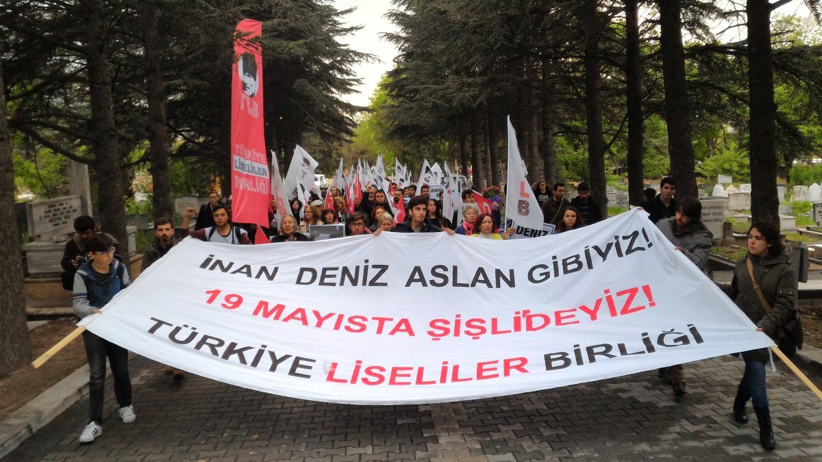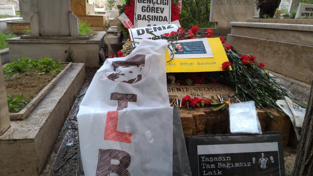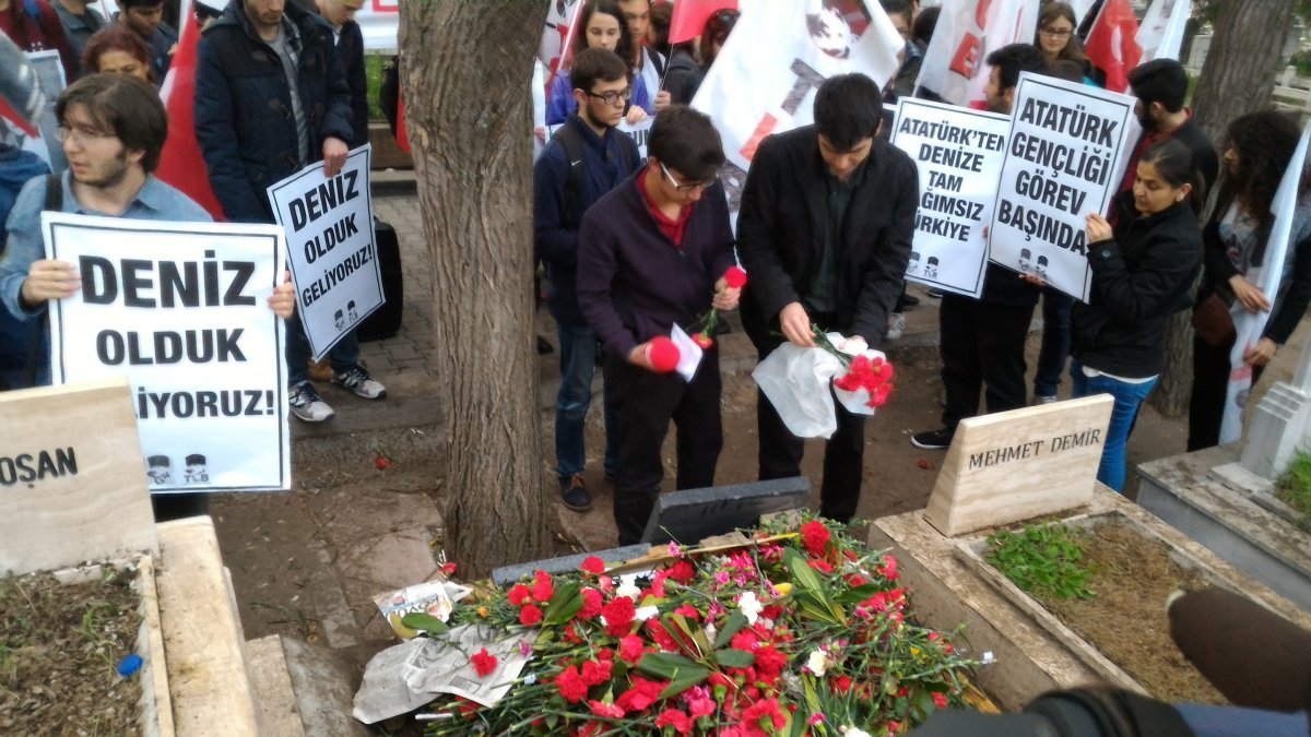 Bundan 44 yıl önce, tam bağımsız Türkiye mücadelesi için canlarını çekinmeden feda eden Deniz Gezmiş, Yusuf Aslan, ve Hüseyin İnan’a yeniden söz vermek için Karşıyaka Mezarlığında toplandık. Mezarlık girişinden, mezarlara kadar yürüyüş gerçekleştirdik ve ardından basın açıklamamızı gerçekleştirdik.