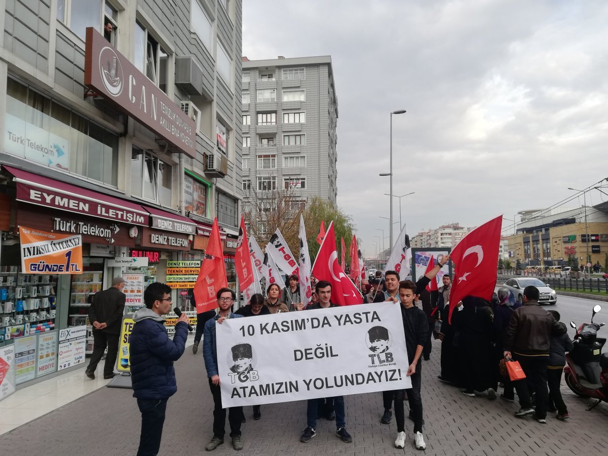 10 Kasım’da yasta değil ayaktayız, Ata’mızın yolundayız sloganı ile gerçekleşen yürüyüşte bugün Mustafa Kemal Atatürk’ün açtığı yolda gösterdiği hedefe yürüyen gençliğin 10 Kasım’ı yas ile değil mücadele ile anması gerektiği, gençliğin Atasının Yolunda olduğu vurgulandı.